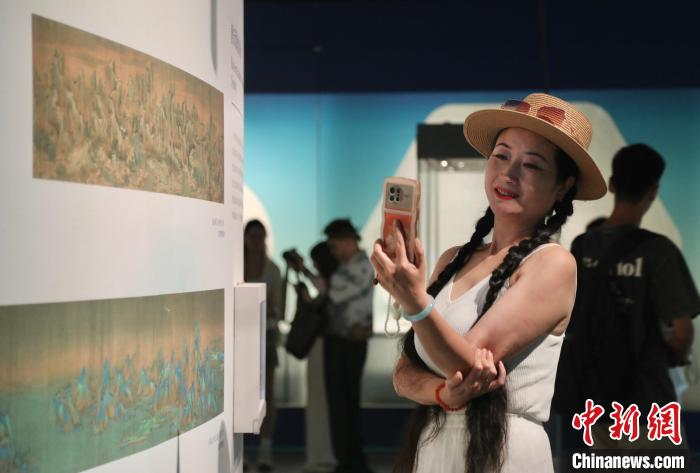 7月16日,四川成都,参观者拍摄苏孙瞻画作《青绿山水卷》。当日,“青·韵——文物里的中国传统色彩美学”特展在成都金沙遗址博物馆启幕。此次展览汇聚了故宫博物院、湖南博物院等20余家文博机构的200余件/组青色系文物,尽显文物里的青色之美。中新社记者 王磊 摄
